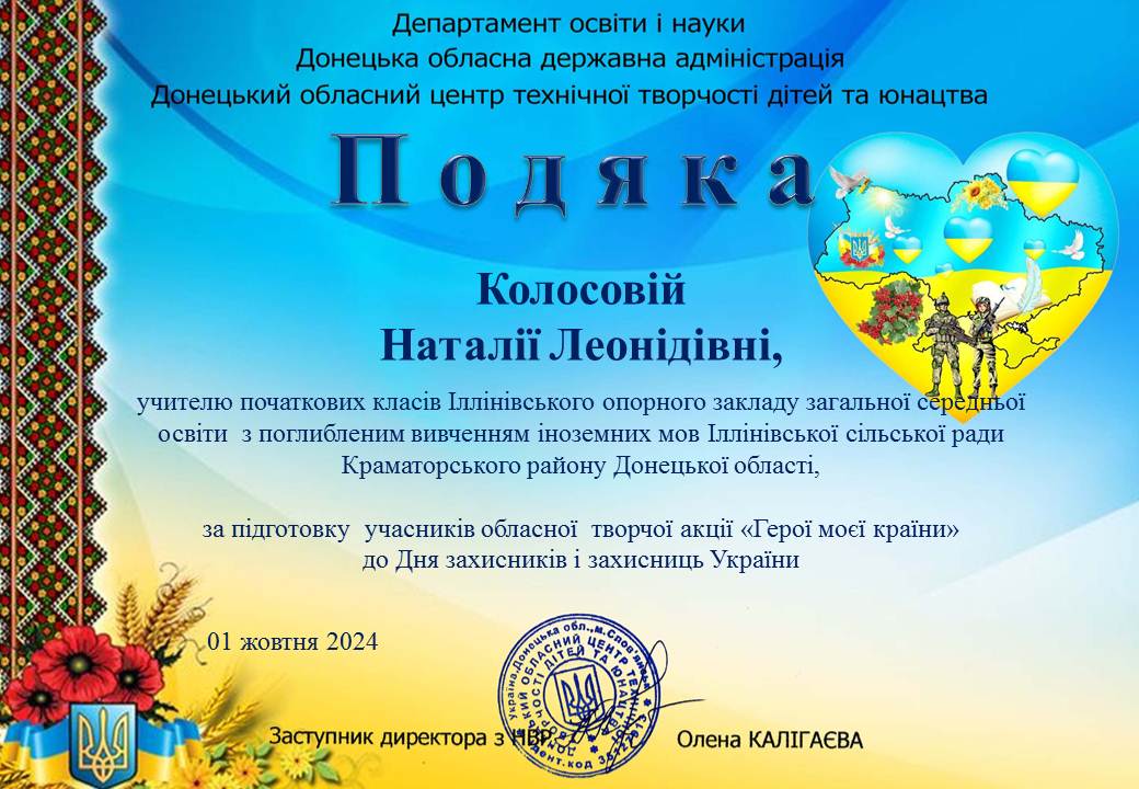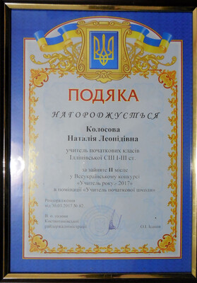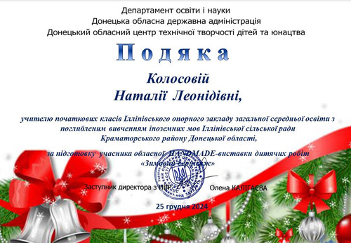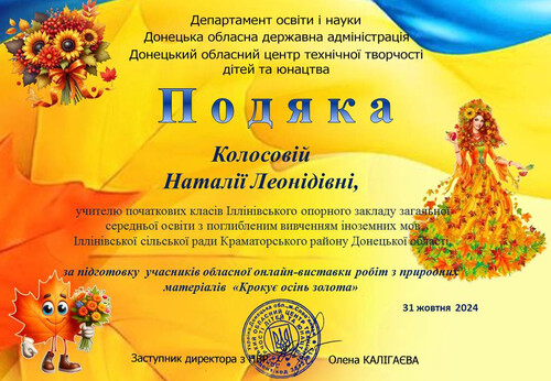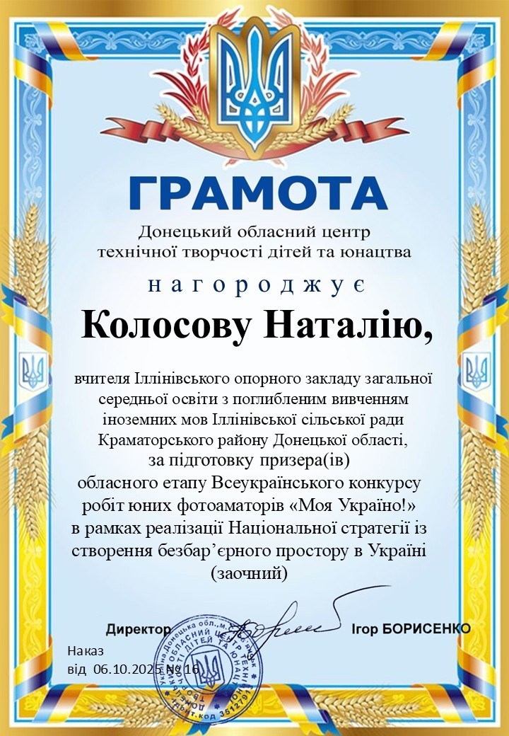 Місце роботи: Іллінівський опорний заклад загальної середньої освіти з поглибленим вивченням іноземних мов Іллінівської сільської ради Краматорського району Донецької областіІллінівський опорний заклад загальної середньої освіти з поглибленим вивченням іноземних мов Іллінівської сільської ради Краматорського району Донецької області